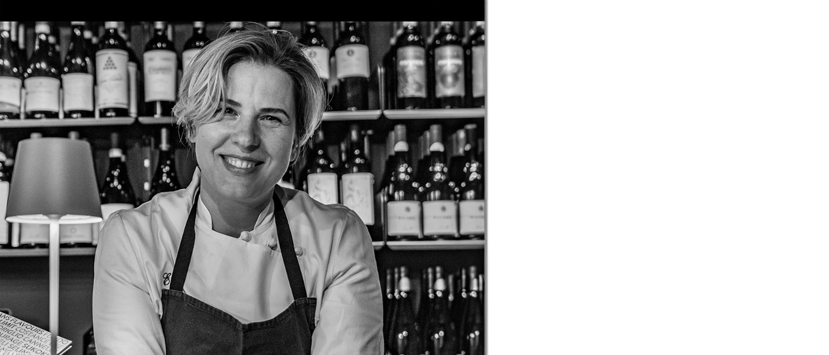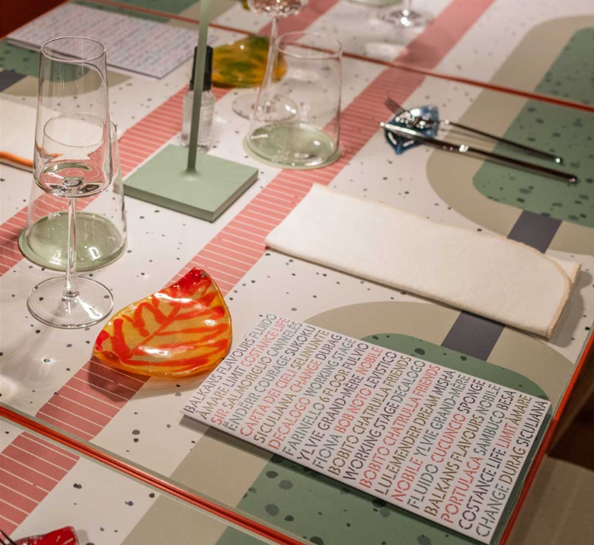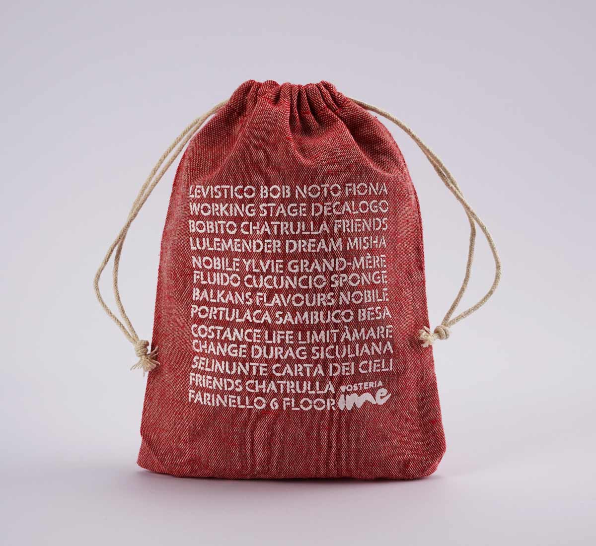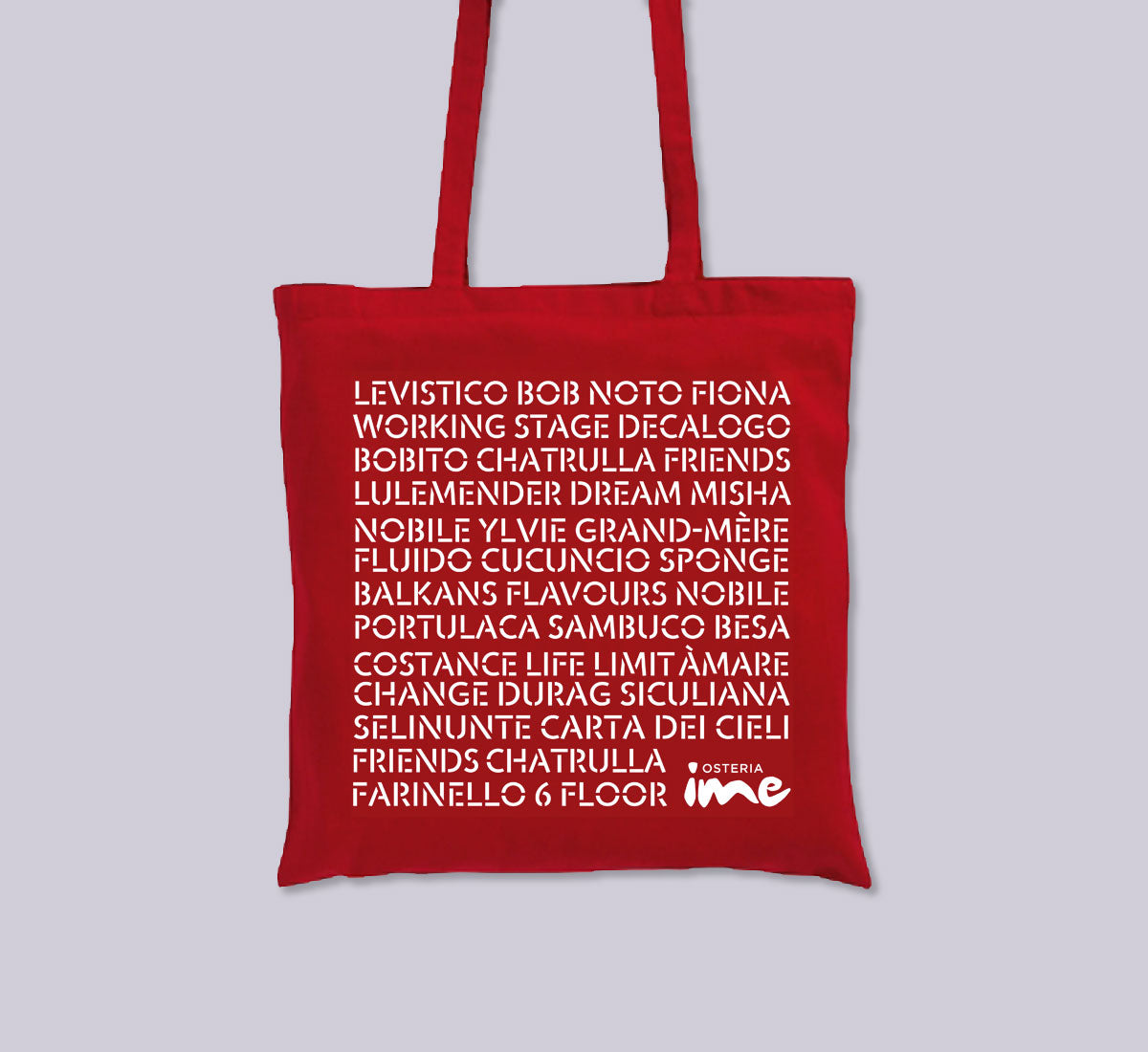 Con Entiana è nata fin da subito un'ottima sinergia e una visione comune della sostenibilità. Ho creato per lei un set di tovaglioli in lino bianco, riciclati con bordino in panama e design ispirato alle cementine del tavolo. Inoltre, abbiamo sviluppato tovaglioli in lino stampato a mano con motivo a terrazzo, perfettamente abbinati ai suoi decori, grembiuli in cotone antimacchia riciclato, sacchettini regalo in cotone rigenerato con scritte che richiamano le sue origini e identità, presenti anche nell'arredamento e nella vetrofonia del locale, e shopping bag in cotone organico.